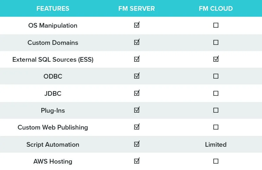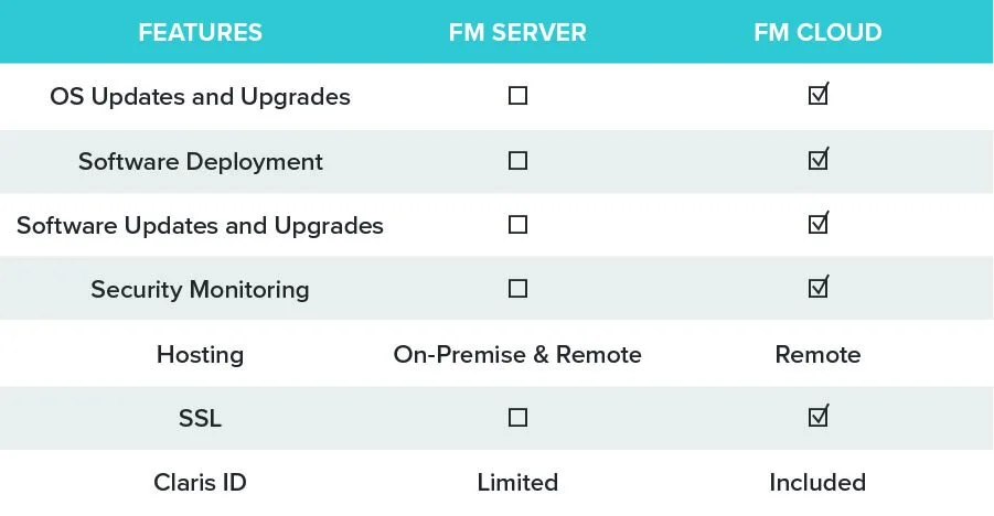 The automated processes within FileMaker Cloud makes it accessible to the organization that doesn’t have the skillset or time to keep up with server maintenance. However, this can also be a pitfall if an automatic upgrade fails mid-process, or it upgrades to a buggy or flawed version. The manual upgrade and deployment processes with FileMaker Server allows for greater control.