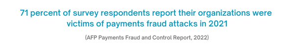 While this number has continually decreased since 2019, it emphasizes how common payment fraud attempts are. According to AFP, in 2021, checks and ACH debits were the payment methods most impacted by fraud activity - 66% and 37%, respectively.